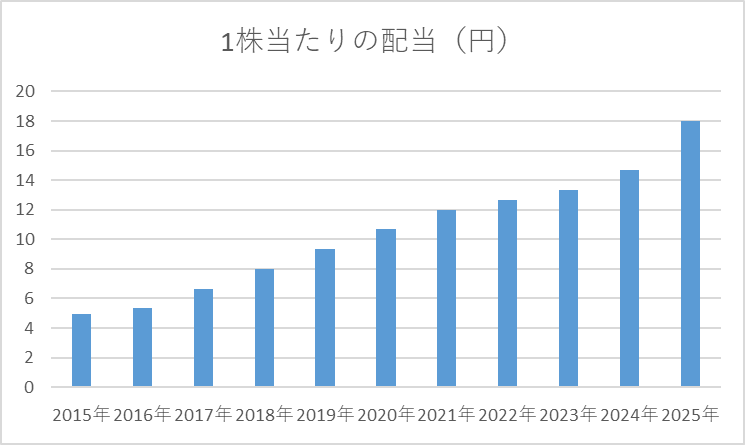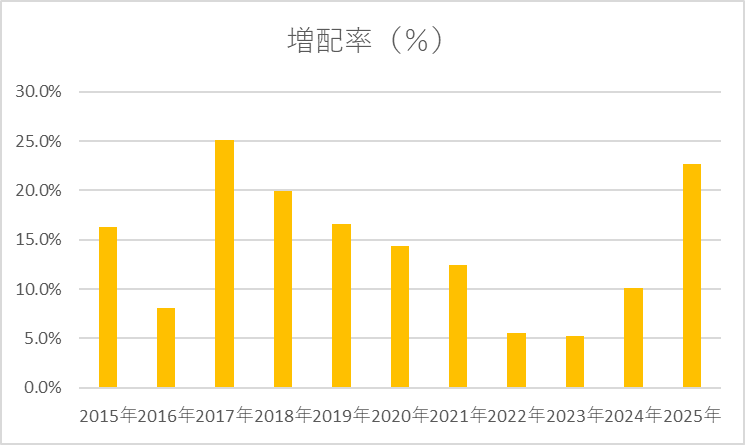 このように、増配率は年度によって変動がありますが、極端な減配はなく、安定的に配当を増やしていく傾向が確認できます。大幅な増配年もあれば緩やかな増配年もあるため、株価変動に左右されにくく、長期投資家にとって将来のインカムゲインを予測しやすい銘柄と言えます。