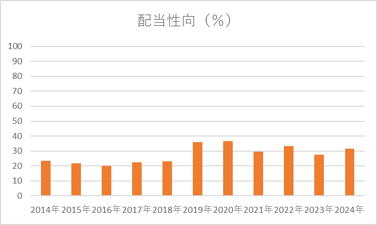 配当性向は2010年代は20%前後で推移しており、株主還元は控えめでした。近年は30%前後まで上昇しており、2024年は31.6%です。まだまだ無理のない範囲であり、増配余力は十分残されています。利益の成長に応じて、今後も安定的な増配が続く可能性が高いと評価できます。