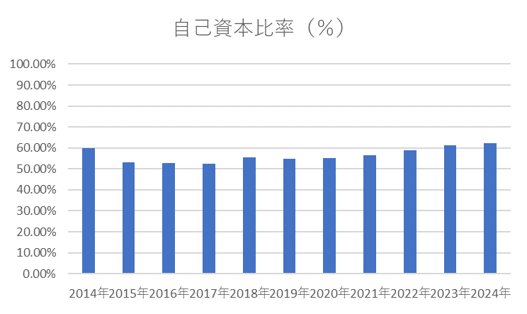 ユニ・チャームの自己資本比率は、過去10年を通じて50〜62%と一貫して高水準です。2024年は62.3%とさらに改善しており、極めて健全な財務体質を維持しています。製造業でこの水準は優良といえ、財務安定性と配当の持続力を裏付ける指標です。