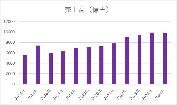 ユニ・チャームの売上高を見ると、過去10年間で着実な成長を示しています。2014年の5537億円から始まり、直近では9740億円に達しており、景気変動や外部環境の影響を受けながらも総じて右肩上がりの推移です。