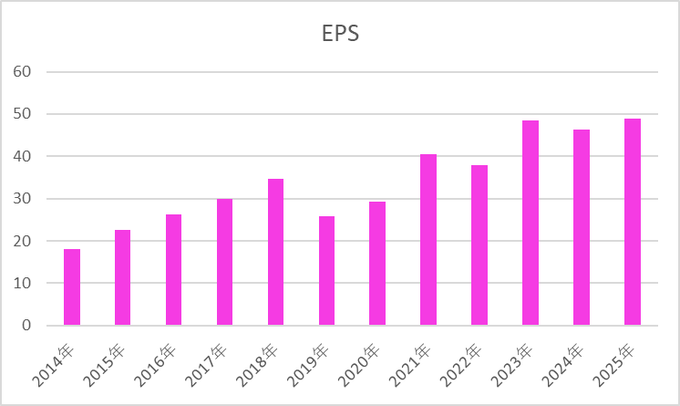 ユニ・チャームの1株当たり利益(EPS)は、過去10年間で概ね増加傾向を示しており、企業の収益力が長期的に成長していることが分かります。