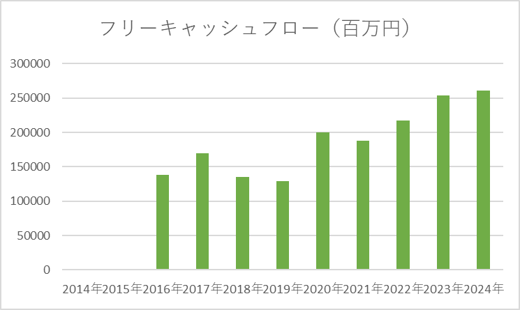 フリーキャッシュフロー(FCF)は、全体としてプラスで推移していることから、事業活動から安定して現金を生み出す力が高まっていることがうかがえます。企業の成長投資や配当の原資として十分な余力を持っています。