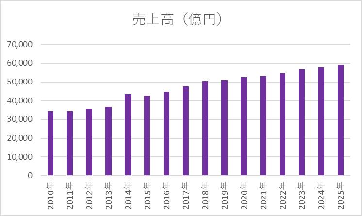 KDDIの売上高は、過去15年間で着実に拡大しています。2010年3月期の約3兆4,421億円から、2025年3月期には約5兆9,179億円へと増加しており、安定的な成長が確認できます。特に国内通信事業を軸に、固定通信やグループ会社の事業拡大が売上を支えています。成熟市場である通信業界において、このような右肩上がりの売上を維持できている点は、収益基盤の安定性を示す重要な指標です。
