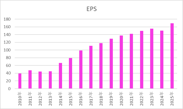 長期的にEPSが右肩上がりで推移しており、利益成長が配当の裏付けになっています。一時的な業績ブレはあるものの、総じて安定して利益を積み上げられる体質であるため、今後も増配の継続が期待できます。
