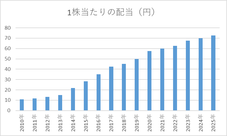 直近10年で概ね2〜5%の増配。派手ではないが安定性重視の増配ペース。