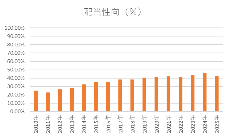 過去15年間の配当性向は20〜50%前後で安定しています。利益に応じて柔軟に配当を調整する方針で、急激な減配リスクは低く、無理のない範囲で株主還元を行っていることがわかります。