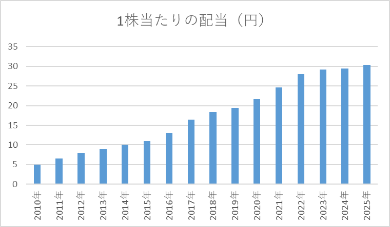 配当性向は10〜20%台で推移しており、企業としてはまだ多くの余力を残しています。2025年時点でも20%強にとどまっているため、減益局面でも増配を維持しやすい財務構造です。収益に対して必要以上に配当を払いすぎている状況ではなく、長期的に安定度の高い水準です。