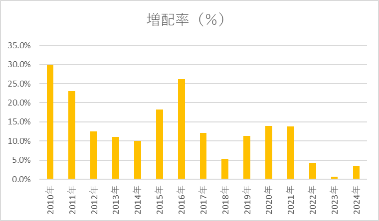 ニトリは増配を継続しているものの、増配率そのものは年々落ち着いてきています。以前は2ケタの増配が当たり前の時期もありましたが、直近では1〜3%程度の小幅な上昇にとどまっています。