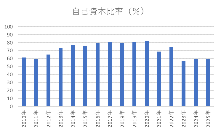 過去は80%前後と非常に高い水準でしたが、近年は60%前後まで低下しています。依然として堅固な財務状態ではあるものの、以前ほどの鉄壁感は薄れています。成長投資や在庫増などが影響している可能性があり、ここは投資家として押さえておきたい変化点です。