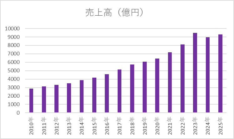 売上高は長期的には拡大傾向を維持してきたものの、直近の伸びは緩やかになっています。2023年をピークに一度落ち込み、2024年以降は回復基調ではあるものの、過去のような強い成長スピードは感じにくくなっています。市場との競争激化や既存店成長の鈍化など、構造的な課題が業績の高止まりにつながっている印象です。