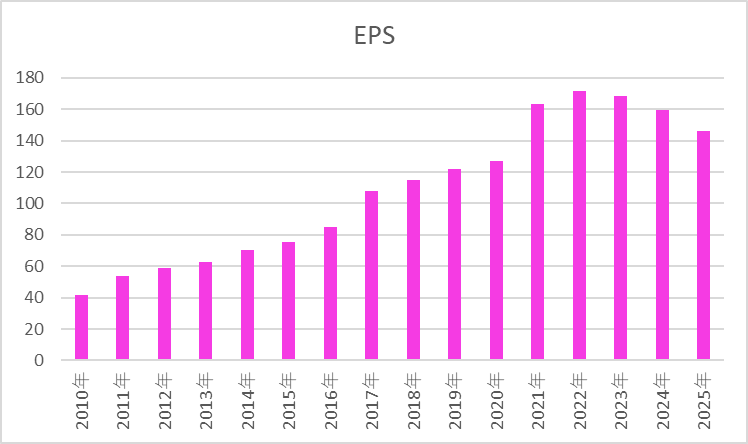 EPSは長期で見れば大きく伸びてきましたが、2023年以降はマイナス成長が続き、2025年には2010年代後半の水準に逆戻りしています。コスト上昇や需要変動の影響が収益性を圧迫しており、「利益の伸びに陰りが見え始めた」という表現が適切です。再び成長軌道に乗せられるかが中期的なポイントになります。