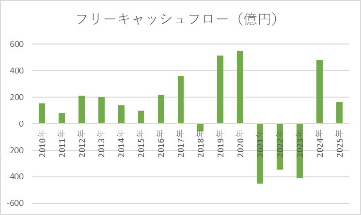 FCFは年ごとのブレが極めて大きく、マイナスとプラスを繰り返しています。ただし、プラスの年は数百億円規模のキャッシュを生み出しており、資金余力が大きく失われているわけではありません。直近2024年のFCFは約480億円と大きく改善しており、投資と運転資金の調整により変動しやすいだけで、キャッシュ枯渇のリスクは限定的と見られます。