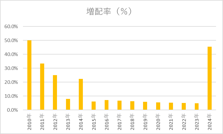 増配率の推移を見ると、長期的には極めて安定した配当成長を続けてきたことが分かります。増配率は低い時でも5%ほどの増配を維持しており、魅力的な水準で増配し続けていると言えるでしょう。