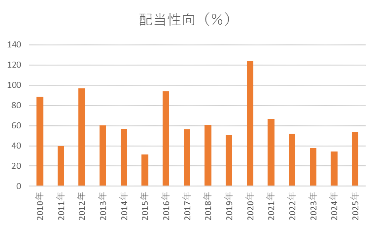配当性向の推移を見ると、全体としてはおおむね30~60%台を中心に推移しています。2020年には配当性向が123.9%となっていますが、これはコロナ禍の影響を受けたものと考えます。