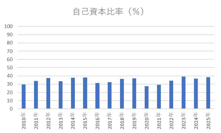 自己資本比率はおおむね30~40%台後半を中心に推移しており、自己資本比率が極端に高いわけではありませんが、安定したキャッシュ創出力を前提とした事業モデルを考えれば、許容範囲といえます。