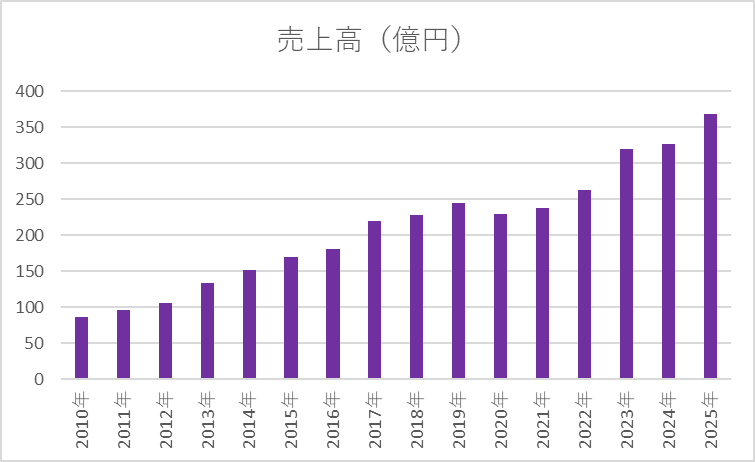 売上高は長期的に一貫した拡大基調にあり、2010年の水準から直近にかけて約4倍超まで積み上がっています。年ごとの伸びに濃淡はあるものの、途中で大きく崩れる局面は見られず、事業規模を着実に拡大してきた点は高く評価できます。事業基盤そのものが広がってきた結果としての成長と捉えるのが妥当です。