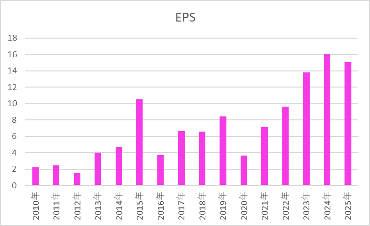EPSは長期で見ると明確な拡大トレンドにありますが、年ごとの振れ幅が大きい点が特徴です。事業環境や投資負担の影響を受けやすく、利益水準が一時的に大きく低下する局面が何度か見られます。このため、短期的な安定性という観点では評価が分かれる指標といえます。