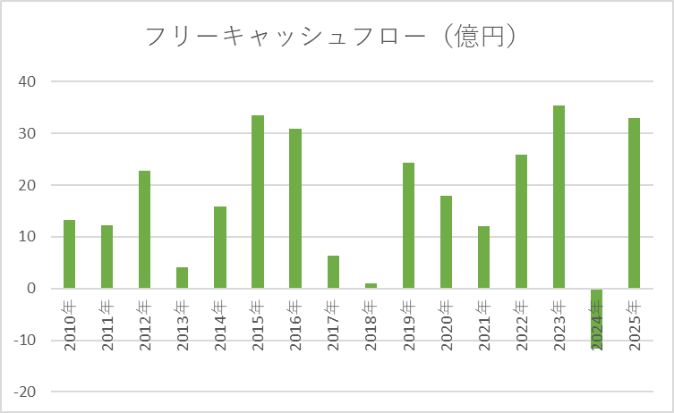 フリーキャッシュフローは全体としてプラス基調で推移しており、事業から現金を生み出す力は確認できます。一方で、年度ごとの変動幅は大きく、設備投資や事業拡大のタイミングによって一時的に水準が低下する局面が見られます。