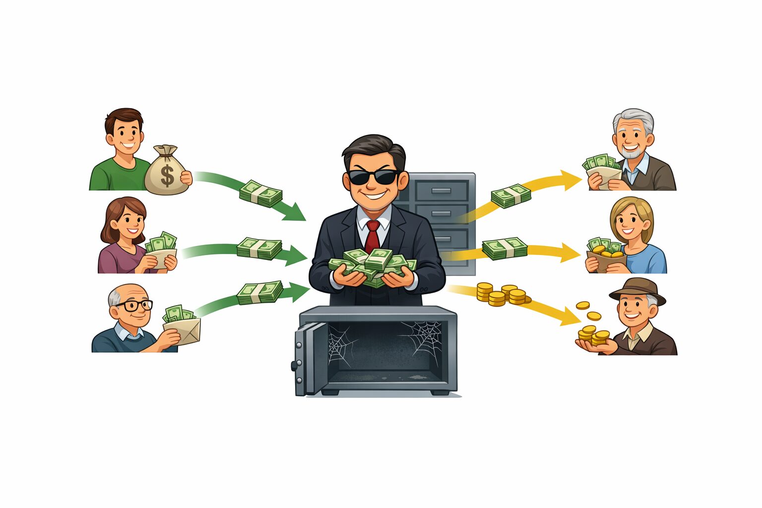 ポンジスキームとは、実際の事業や運用による利益を生まず、新しく参加した人の資金を、既存の参加者への配当として支払う仕組みです。外見上は投資商品のように見えますが、お金は内部で回っているだけで、価値を生み出す活動は存在しません。
